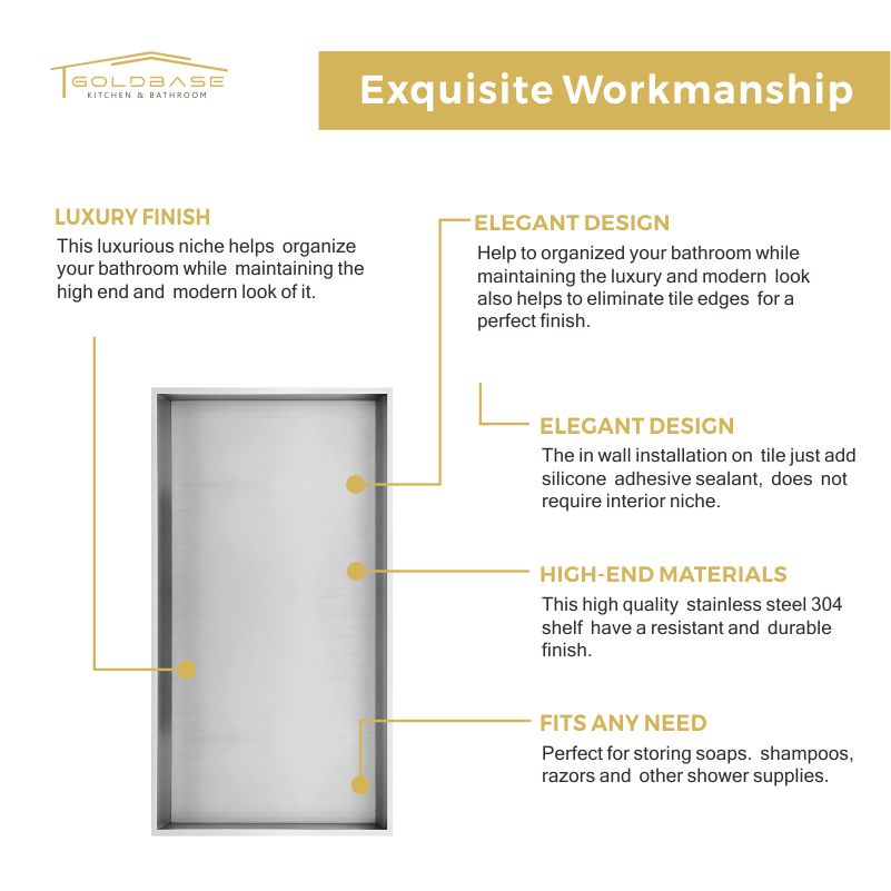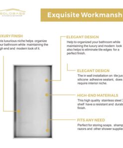 Meticulously crafted from premium stainless steel, this niche boasts exceptional water resistance and long-lasting sturdiness, making it the ultimate solution for the high-humidity environment of showers and bathrooms. Its recessed, built-in design maximizes usable space without sacrificing style, showcasing a clean, modern aesthetic that blends seamlessly with diverse interior schemes—from minimalist elegance to contemporary chic.
