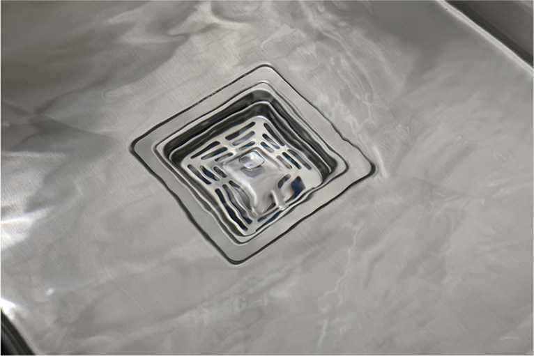 It features 10mm golden-radius inner corners—a defining hallmark of premium sinks—eliminating 90% of hard-to-clean dead spots that plague traditional right-angle designs. Test data speaks for itself: with the same usage frequency, R10 rounded corners reduce bacterial growth by approximately 80%. Complementing this, its X-shaped diversion channel base speeds up water flow, flushing debris straight into the drain—no manual scraping required.
