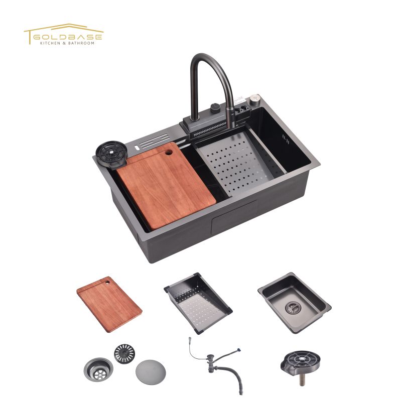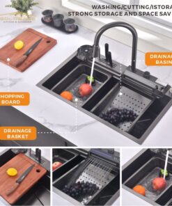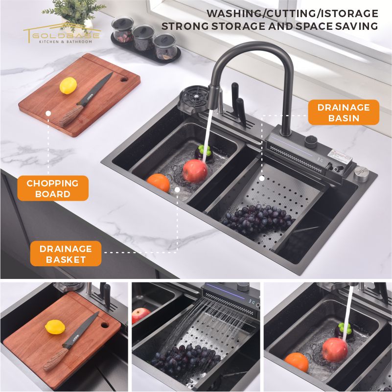 This 304 stainless steel multi-functional kitchen sink comes as a complete package, equipped with all the essential accessories to meet your daily needs. Included are colander, pull-down faucet, folding rack, rinse grid, soap dispenser, dedicated water purifier tap, chopping board, and drain system. Each component is thoughtfully designed to work together, offering a highly efficient and convenient cooking experience. From food preparation and cleaning to organization, this sink set ensures your kitchen operates smoothly and functionally, making it a versatile and user-friendly addition to any modern home.