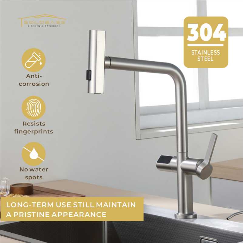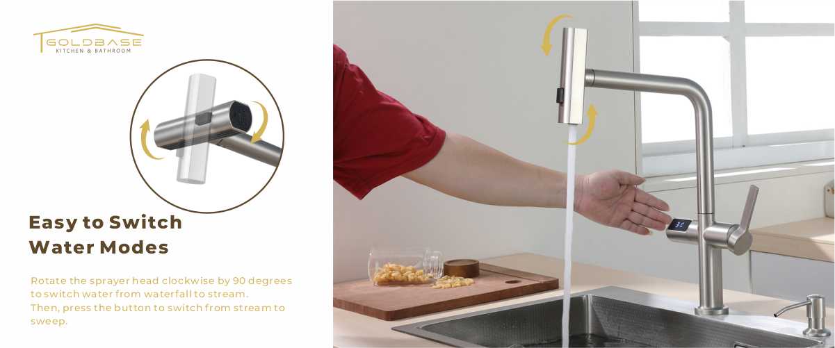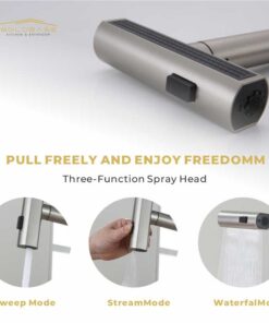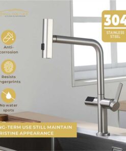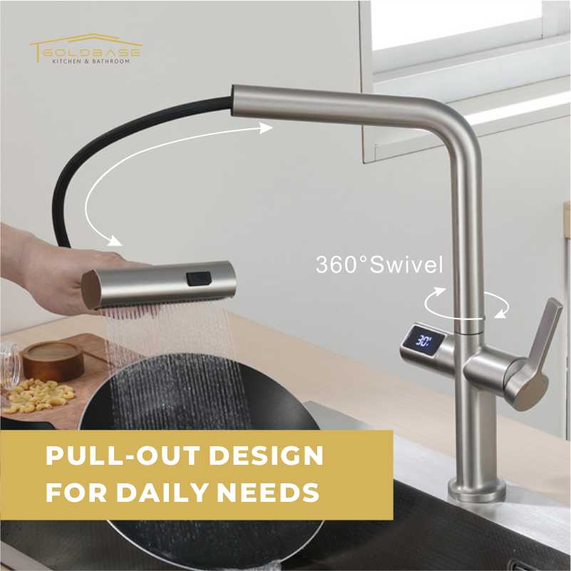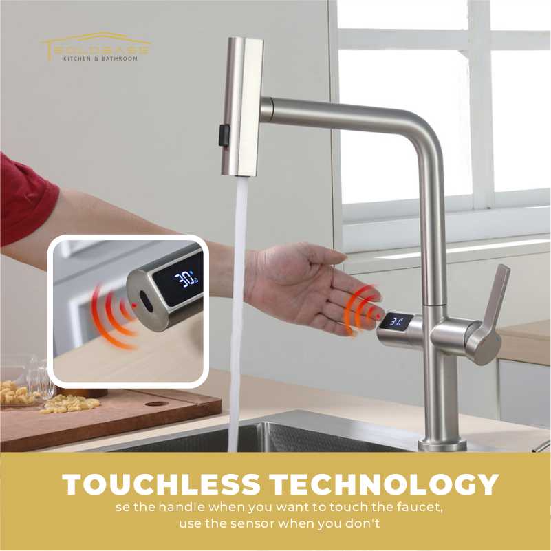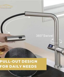Elevate your kitchen experience with this smart pull-out faucet! Equipped with intuitive touch control and a clear LED digital temperature display, it lets you adjust water temp effortlessly. Featuring 3 versatile spray options—including a gentle waterfall mode—it caters to all daily tasks, from rinsing veggies to washing dishes. The pull-out design offers extended reach, ensuring every corner of your sink stays clean. Smart, convenient, and functional, it’s the perfect upgrade for modern kitchens.