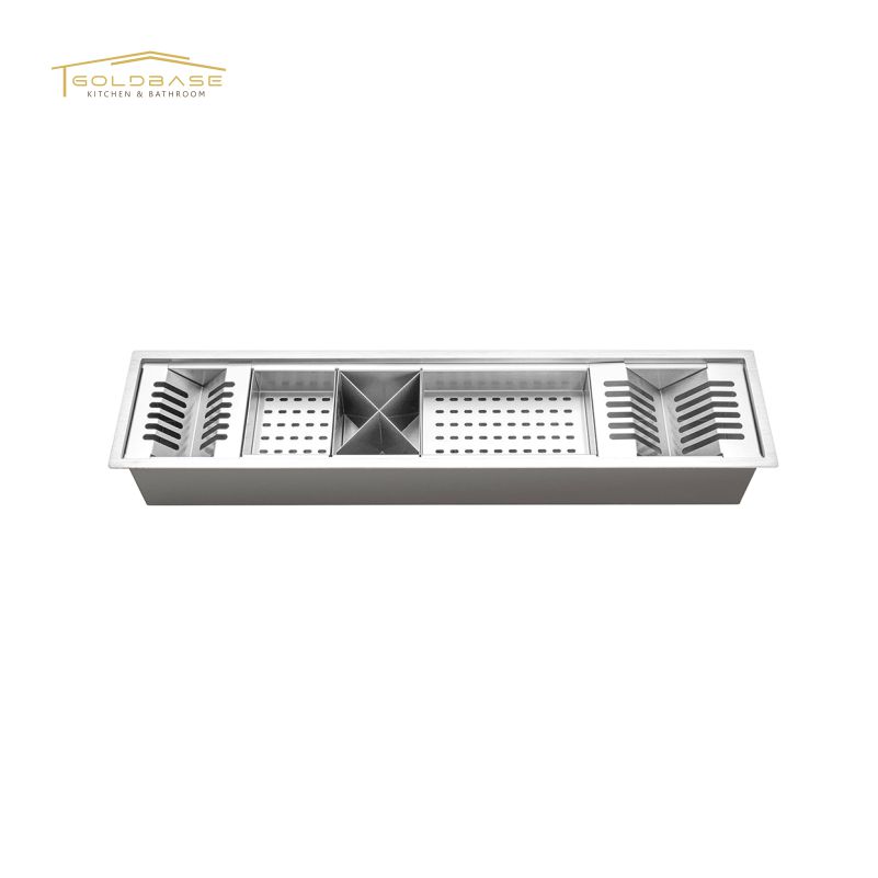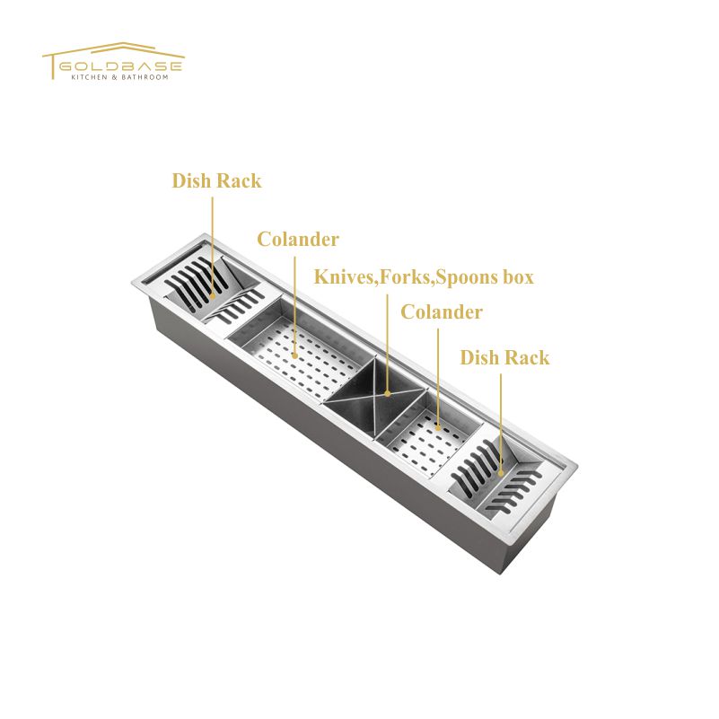 This 304 stainless steel multi-functional kitchen sink package includes colander, pull-down faucet, folding rack, rinse grid, soap dispenser, water purifier tap, chopping board, and drain system. All components work seamlessly for efficient food prep, cleaning, and organization, ideal for modern homes.